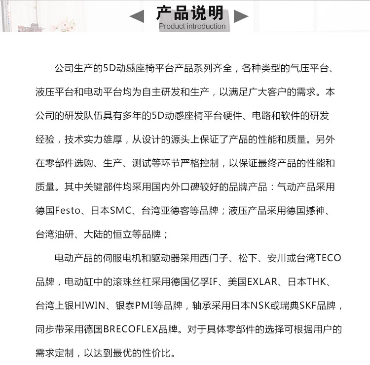 答: 我公司主要從事仿真平臺、六自由度平臺和運動平臺控制卡的研發(fā)、生產(chǎn)與銷售,同時承接大型4D/5D/7D影院等工程。專注技術(shù)領(lǐng)先,提升用戶體驗是我們的追求!