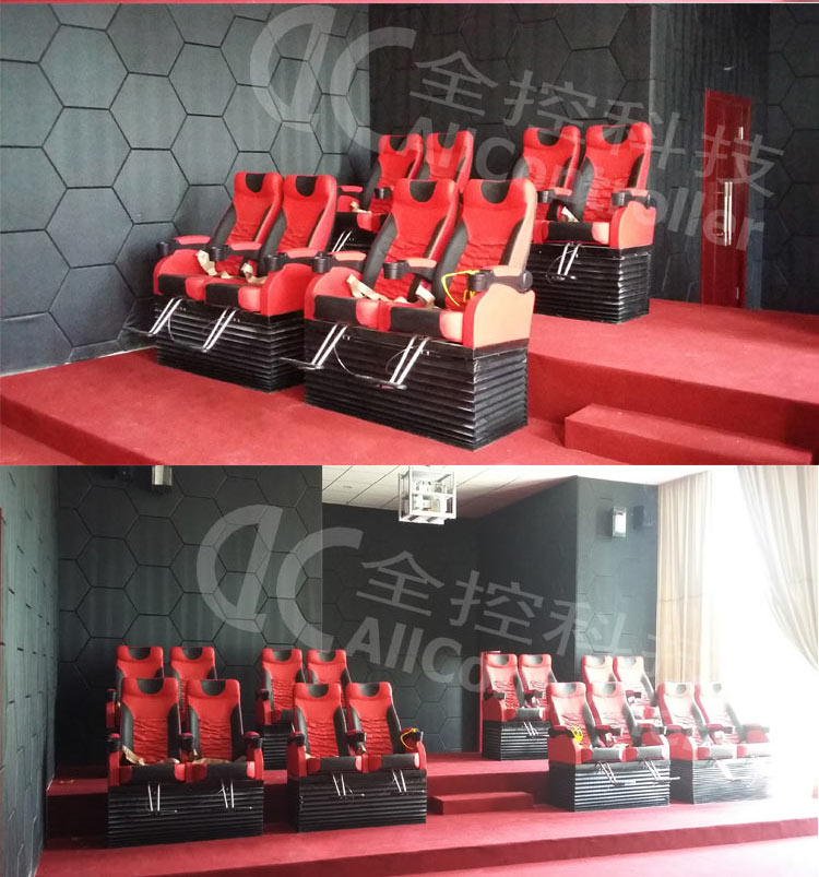 5D 影院是在3D 立體電影的基礎(chǔ)上加環(huán)境特效模擬仿真而組成的新型影視產(chǎn)品。觀眾在看立體電影時(shí),順著影視內(nèi)容的變化,可實(shí)時(shí)感受到風(fēng)暴、雷電、下雨、撞擊、噴灑水霧、拍腿等身邊所發(fā)生與立體影象對(duì)應(yīng)的事件,5D 的座椅具有噴水、噴氣、振動(dòng)、掃腿等功能。環(huán)境模擬仿真是指影院內(nèi)安裝有下雪、下雨、閃電、煙霧等特效設(shè)備,營(yíng)造一種與影片內(nèi)容相一致的環(huán)境。觀眾觀看5D 電影時(shí)有身臨其境,驚險(xiǎn)刺激的感覺,同時(shí)感受科技給人們生活帶來的娛樂和趣味性。5D 動(dòng)感電影的三自由度是載體可做升降、俯仰、擺動(dòng)三種運(yùn)動(dòng)方式。每套座椅可乘坐兩人,組合方便,動(dòng)感效果好。