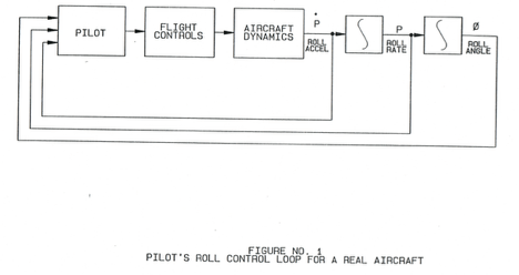 并且可以采用分析方法來(lái)準(zhǔn)確了解就飛行員而言運(yùn)動(dòng)基座在做什么。圖1顯示了實(shí)際飛機(jī)的飛行員側(cè)傾控制回路的框圖。飛行員從飛機(jī)上得到提示,告訴他飛機(jī)在做什么。側(cè)傾加速度和速度提示是“褲子座位”中的主要提示,而側(cè)傾角度提示則完全可見(jiàn)。誠(chéng)然,飛行員可以從窗外看到一些速度提示,但是在瞬態(tài)條件下,飛行員很難,因?yàn)樗仨毻ㄟ^(guò)心理上的區(qū)分來(lái)得出速度。飛行員無(wú)法通過(guò)向窗外看來(lái)獲得加速度提示。