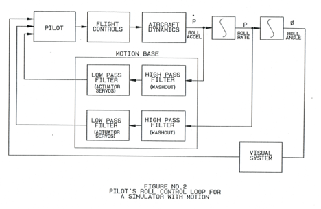 圖2顯示了帶有運(yùn)動(dòng)模擬器的飛行員的側(cè)傾控制環(huán)。滾動(dòng)加速度和速度反饋信號(hào)仍然存在,盡管它們已被兩個(gè)濾波器修改。顯而易見(jiàn),這些濾波器的設(shè)計(jì)至關(guān)重要。