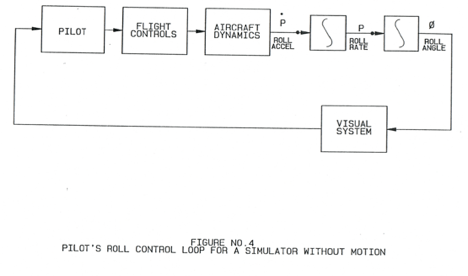 圖4顯示了沒(méi)有運(yùn)動(dòng)的模擬器飛行員的側(cè)傾控制環(huán)。請(qǐng)注意,完全沒(méi)有加速度反饋,并且必須通過(guò)將滾動(dòng)位置與視覺(jué)顯示區(qū)分開(kāi)來(lái)得出任何速率信息。從分析上可以看出,除非飛行員大幅度改變其補(bǔ)償(即他使用提示來(lái)控制飛機(jī)的方式),否則側(cè)傾控制回路將變得不穩(wěn)定。此外,飛行員在運(yùn)動(dòng)時(shí)的陣風(fēng)反應(yīng)與運(yùn)動(dòng)時(shí)的陣風(fēng)反應(yīng)完全不同。